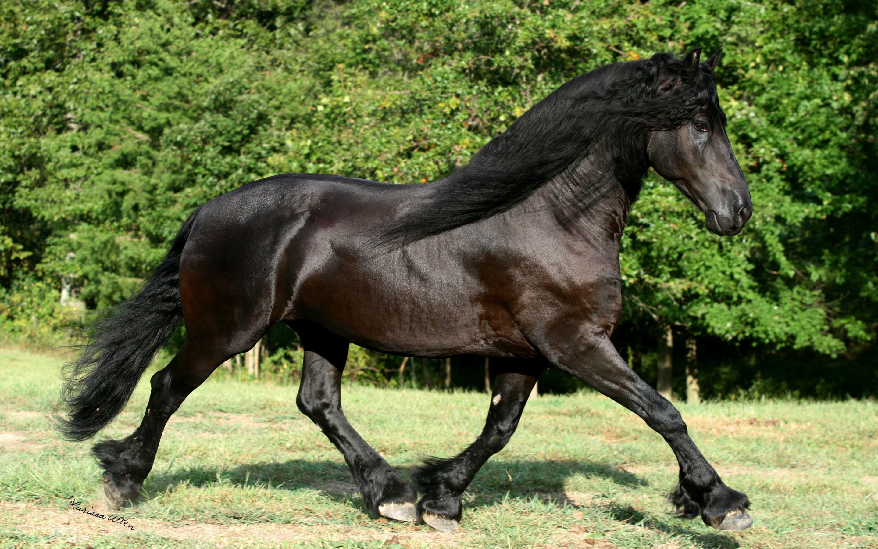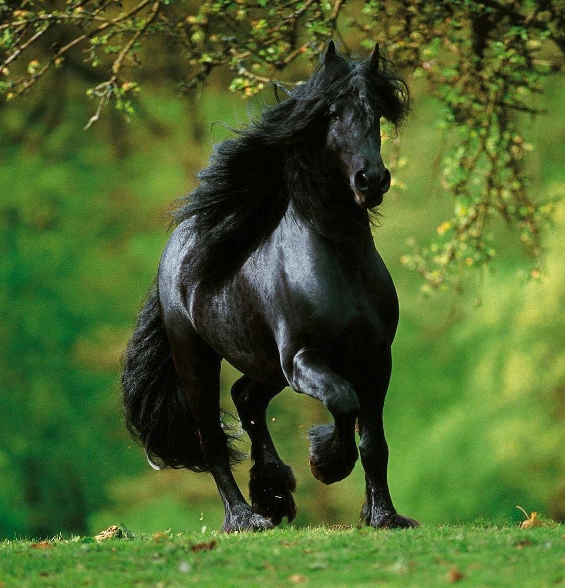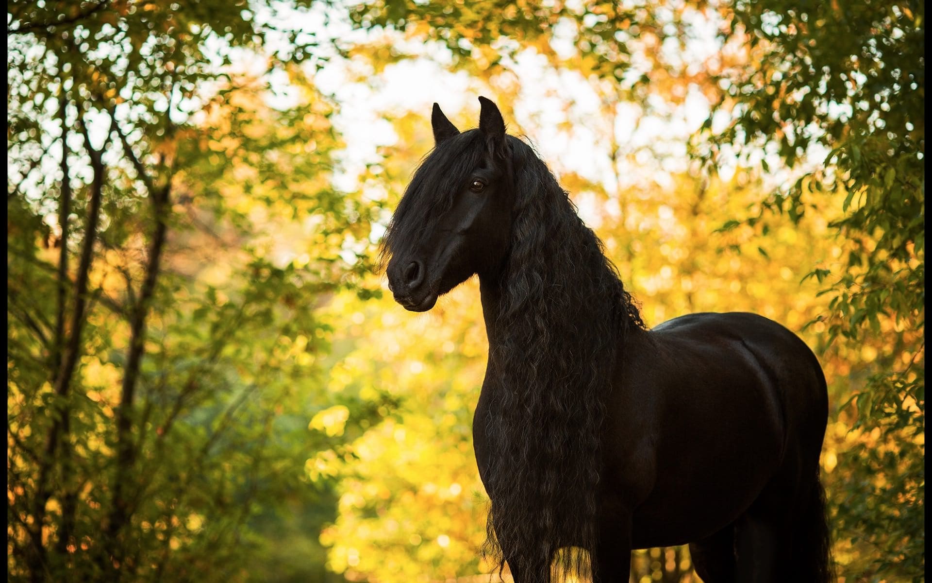 Красивая черная лошадь с длинной волнистой гривой стоит в солнечном лесу