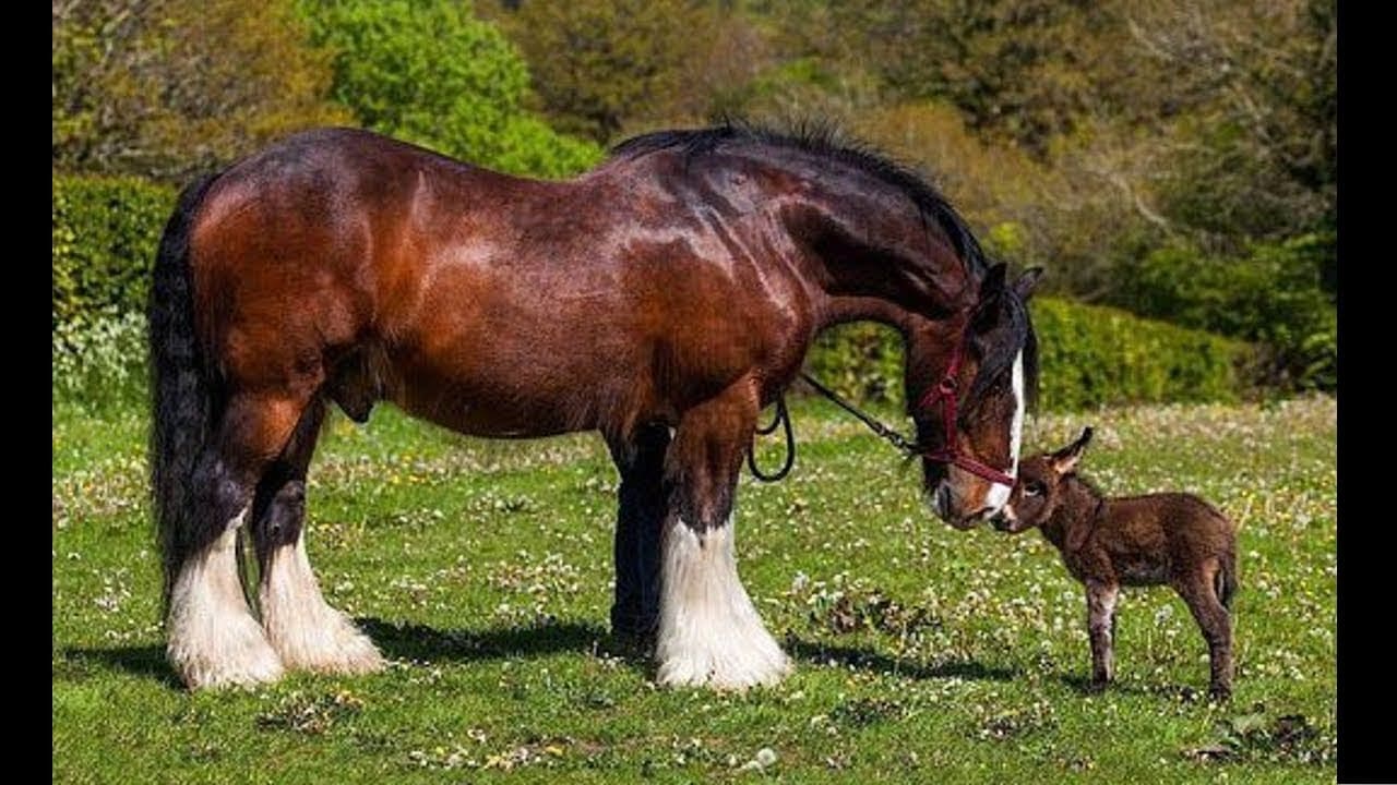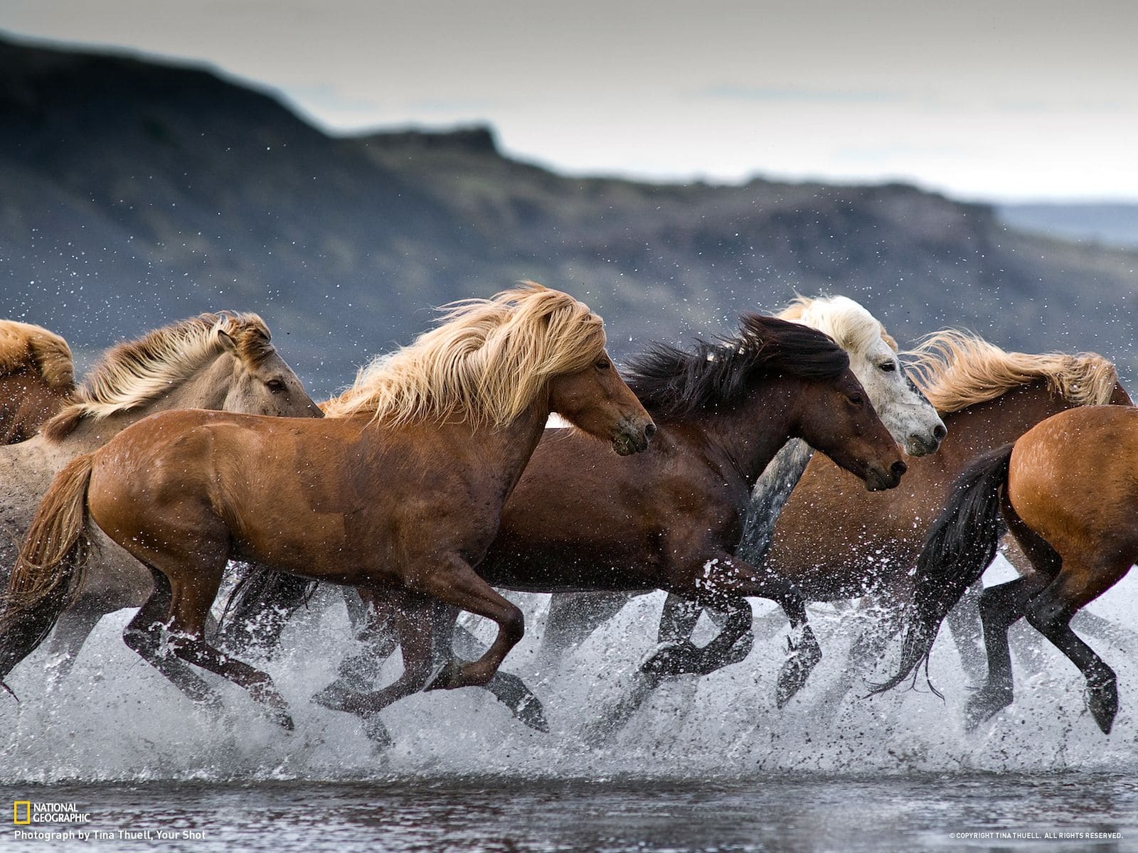 Семья из двух лошадей и жеребенка идет по воде на фоне гор и голубого неба