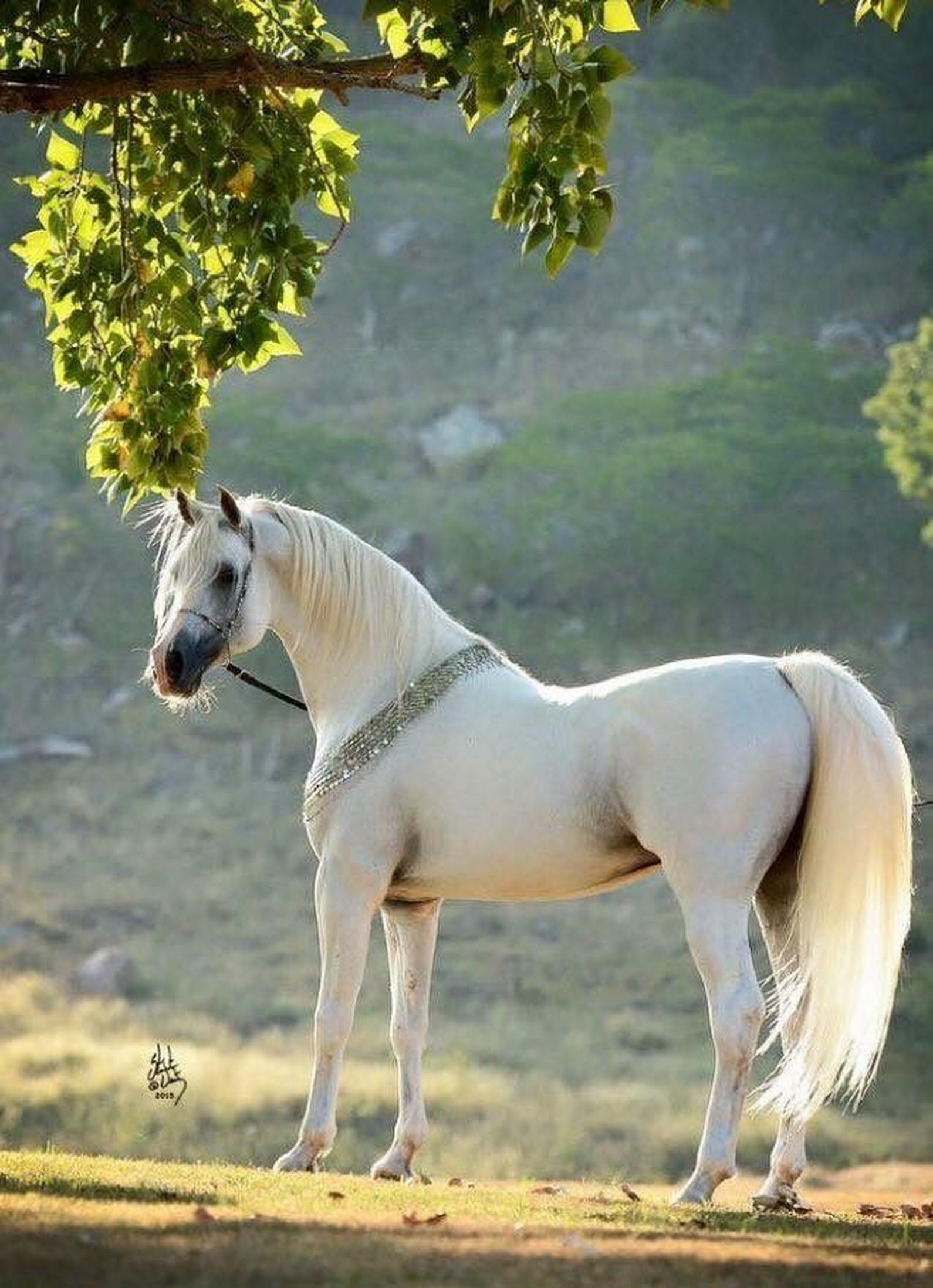 Прекрасная белоснежная лошадь стоит под деревом на фоне холма