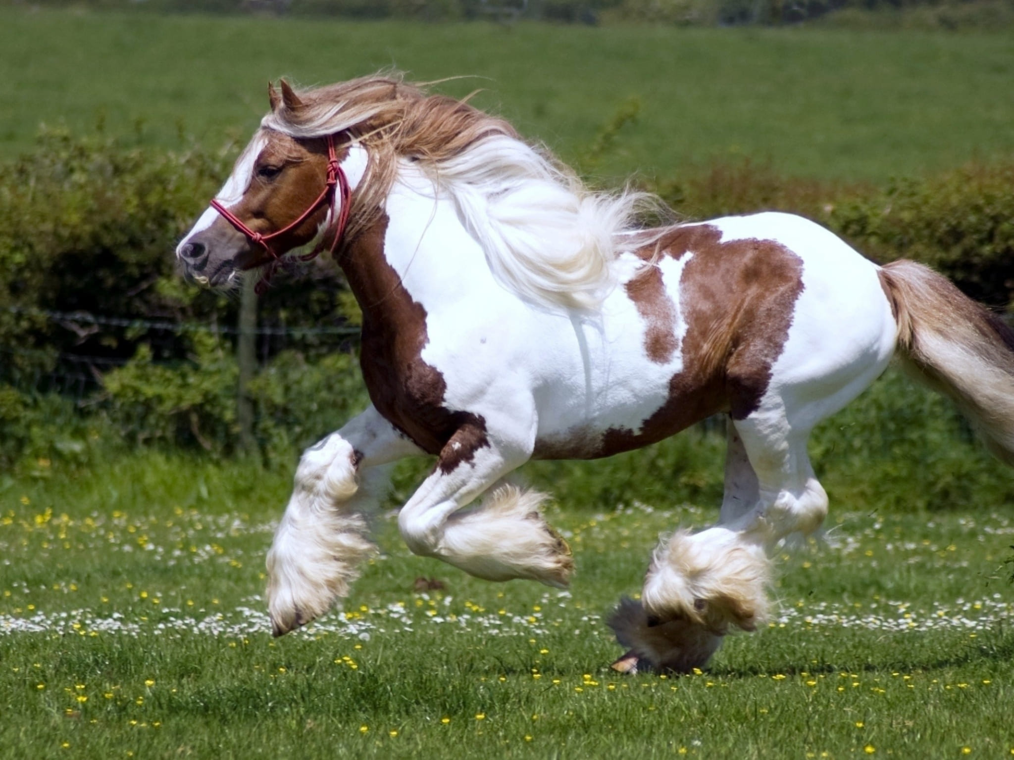 Красивая бело-коричневая лошадь мчится по зеленой лужайке