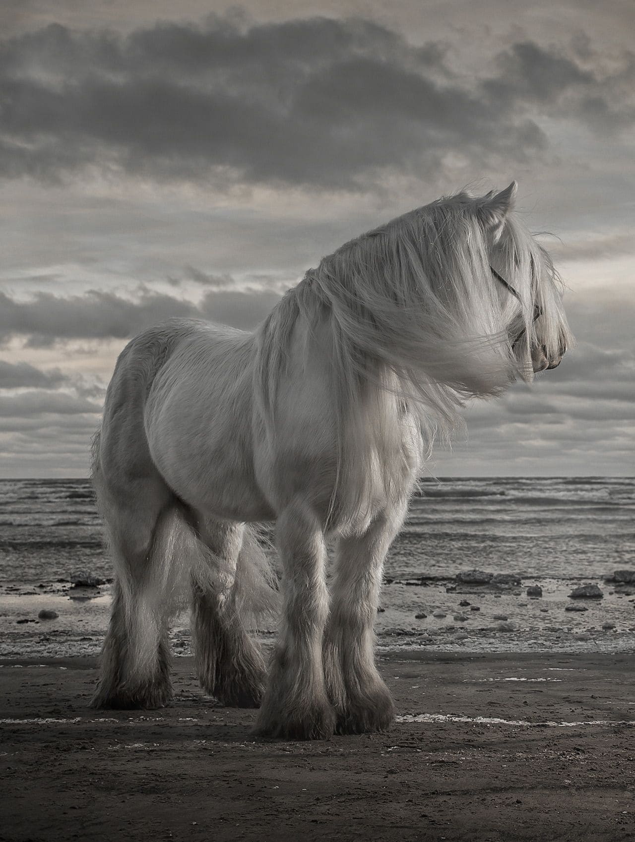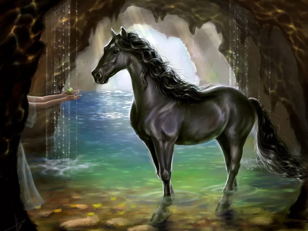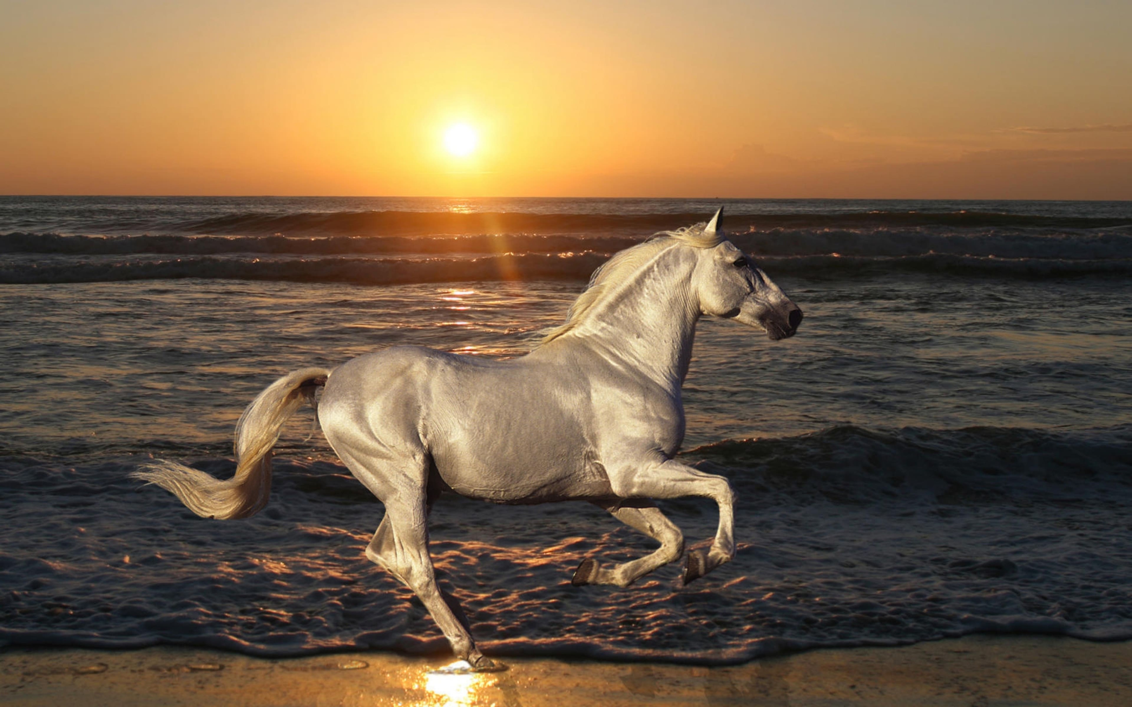 Три сказочных белых коня несутся по бурному морю под звездным небом