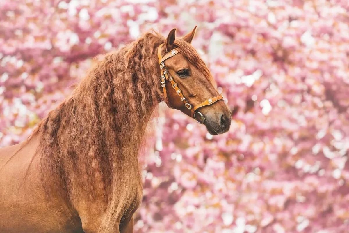 Лошадь в красивой уздечке стоит возле дерева с красными цветами
