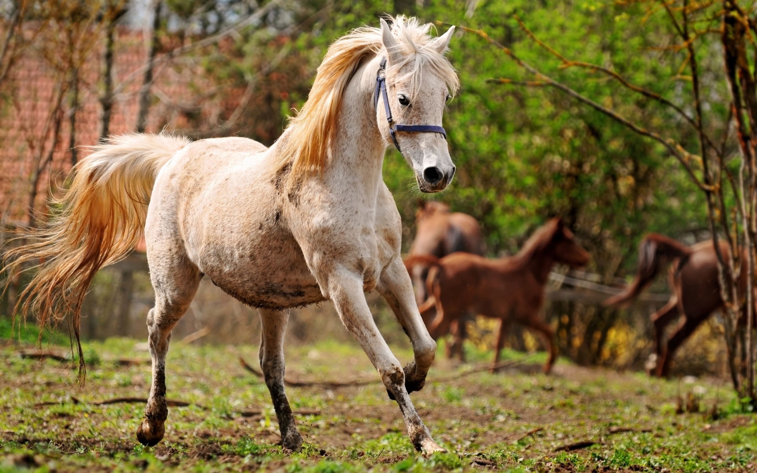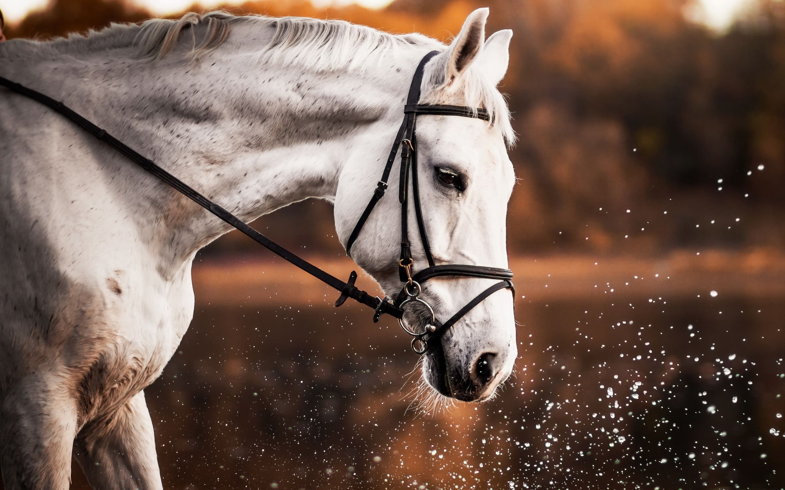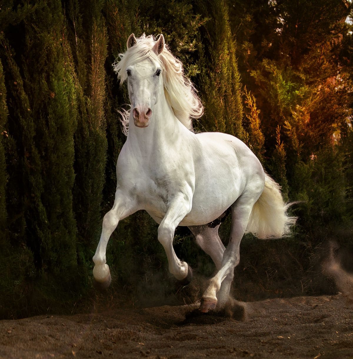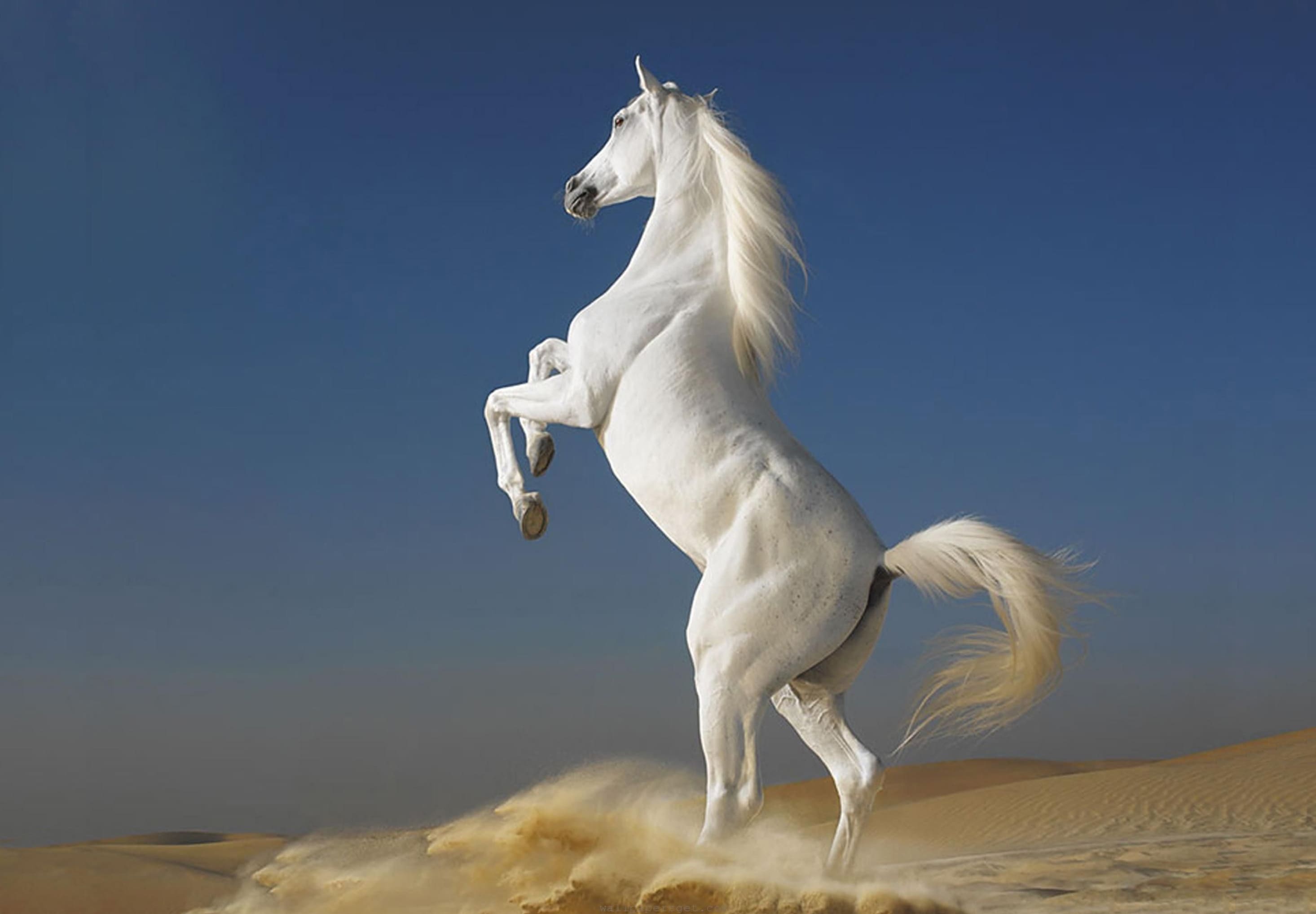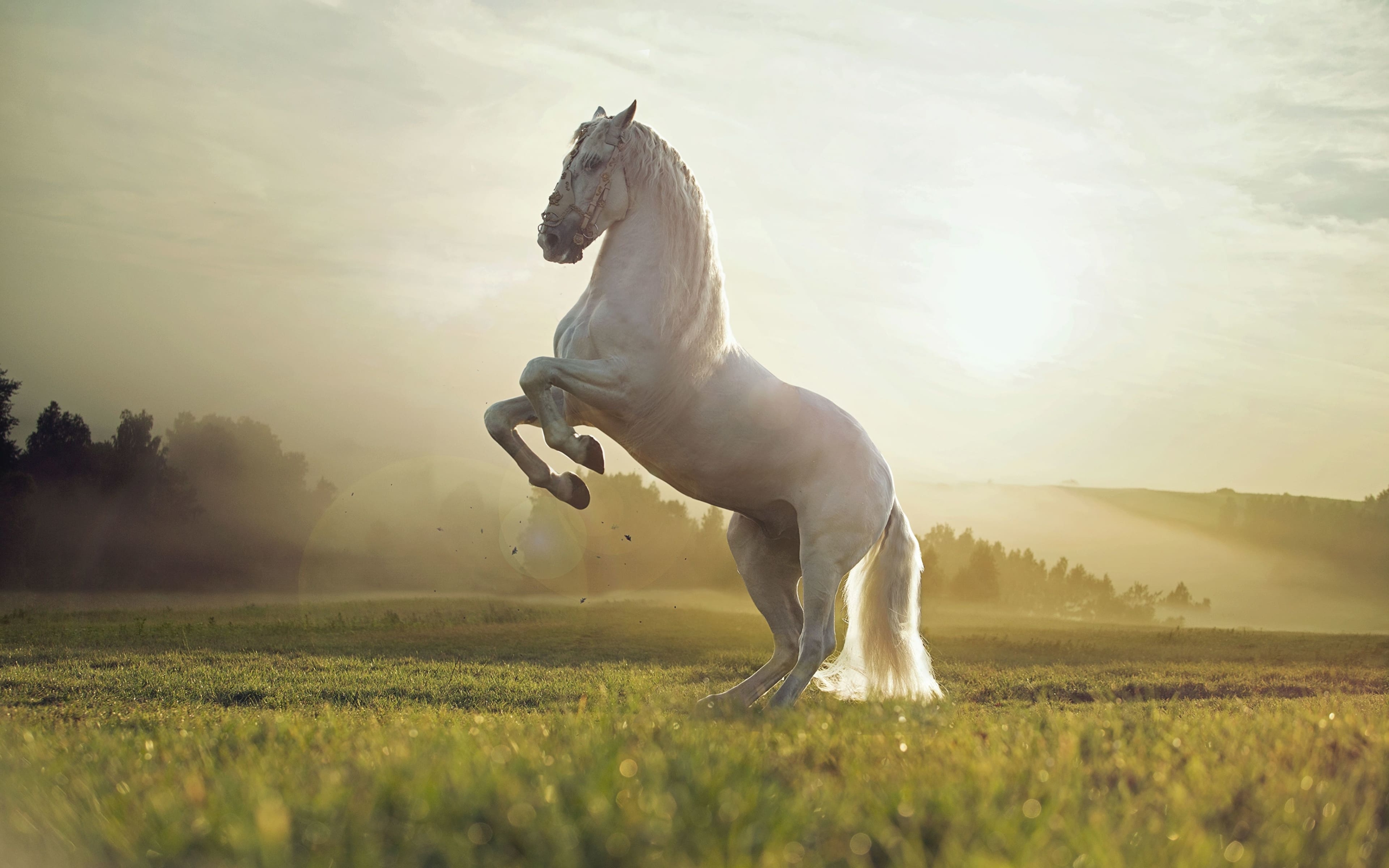 Величественный белый конь стоит на задних копытах посреди зеленого луга, залитого солнечным светом