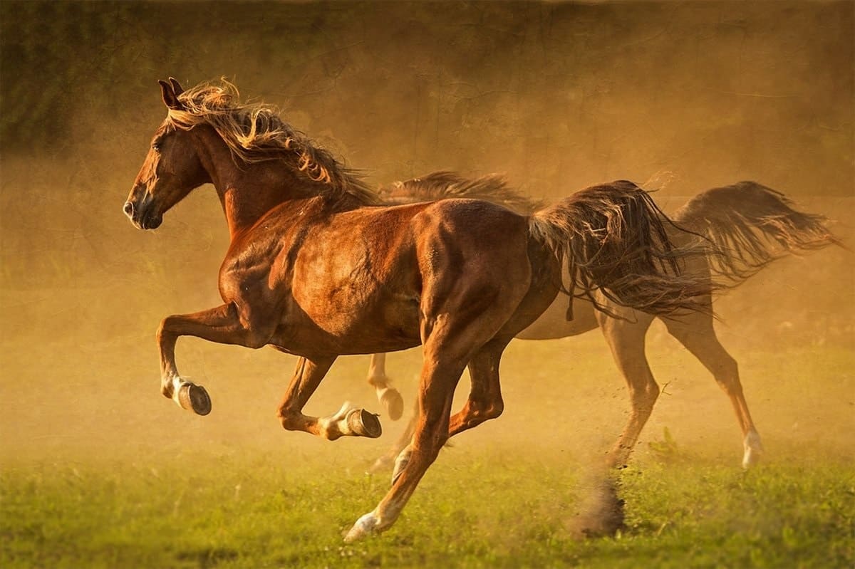 Пара скаковых лошадей мчится вперед, поднимая пыль на фоне серого неба