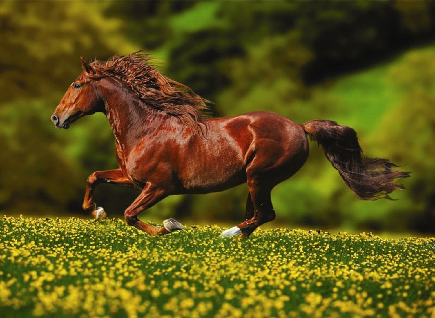 Коричневая лошадь с белой гривой бредет по желтому полю