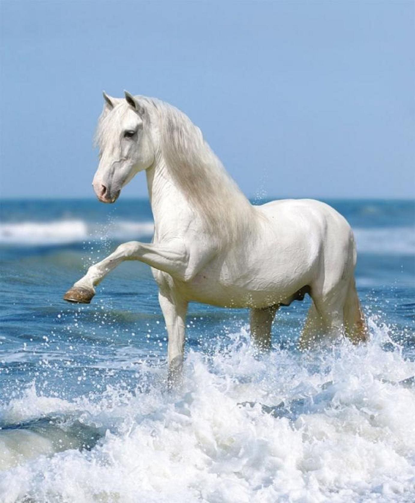 Прекрасная лошадь с белой гривой идет по воде на фоне голубого неба