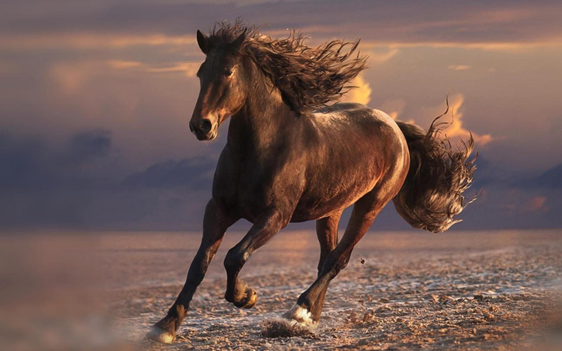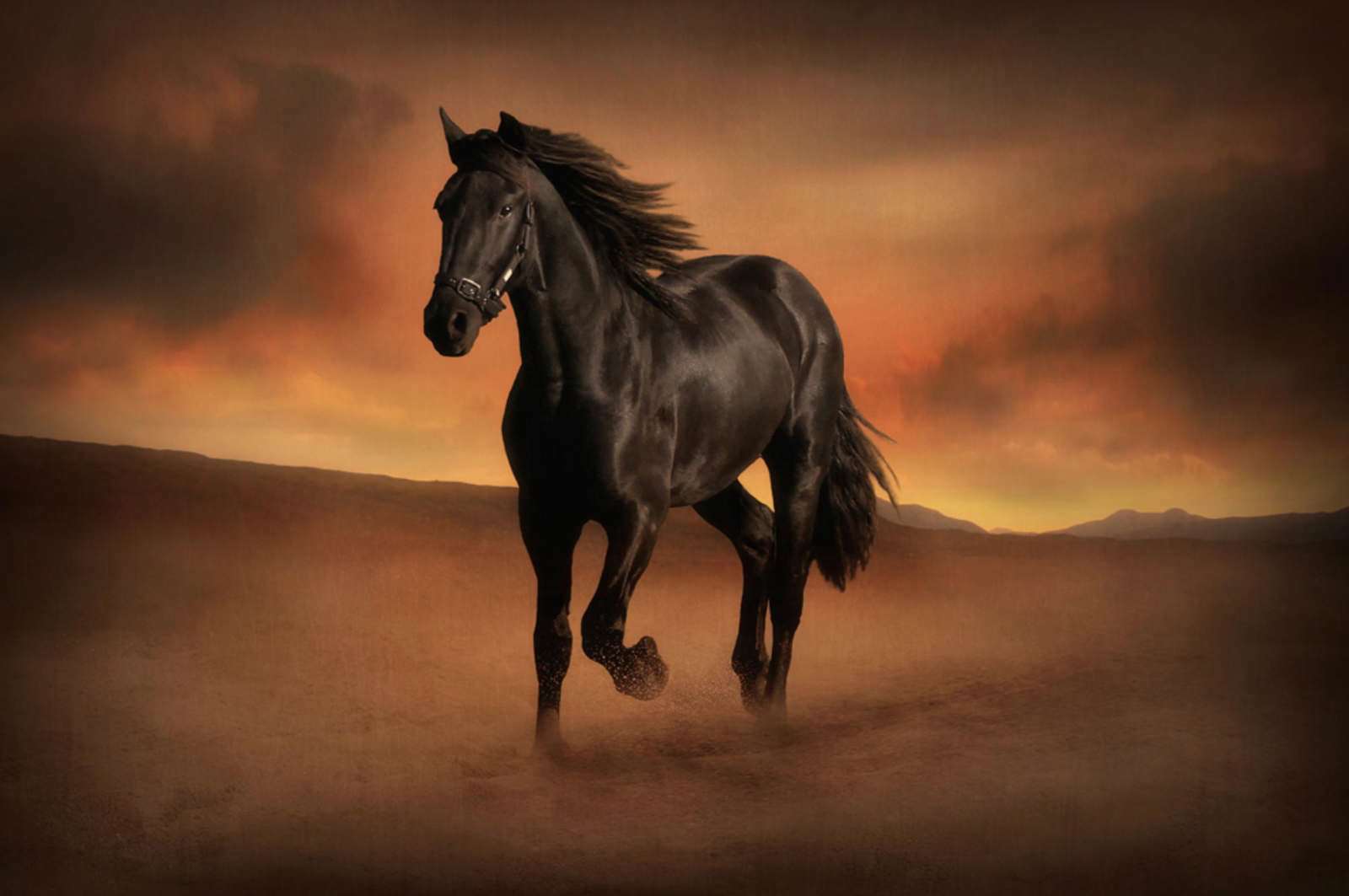 Красивый вороной конь скачет по пустыне на фоне яркого закатного неба
