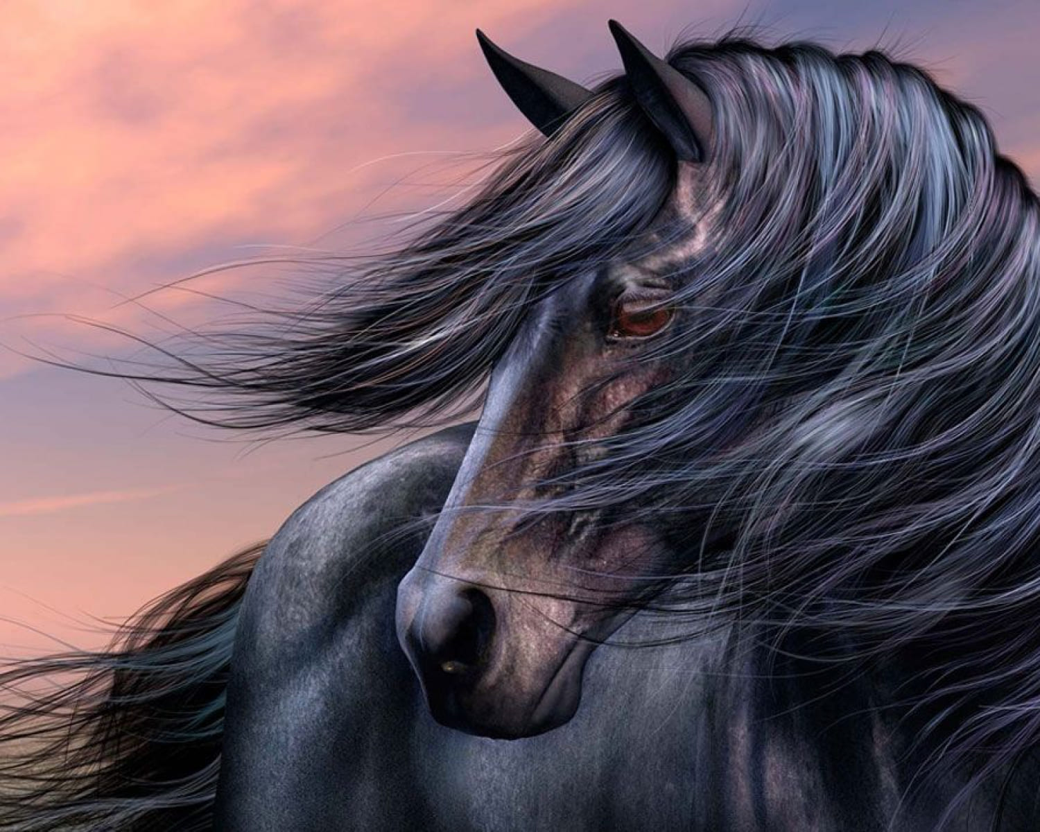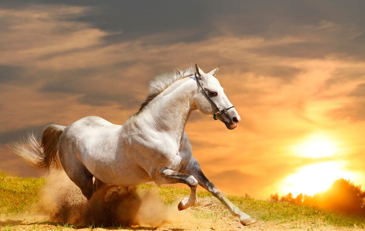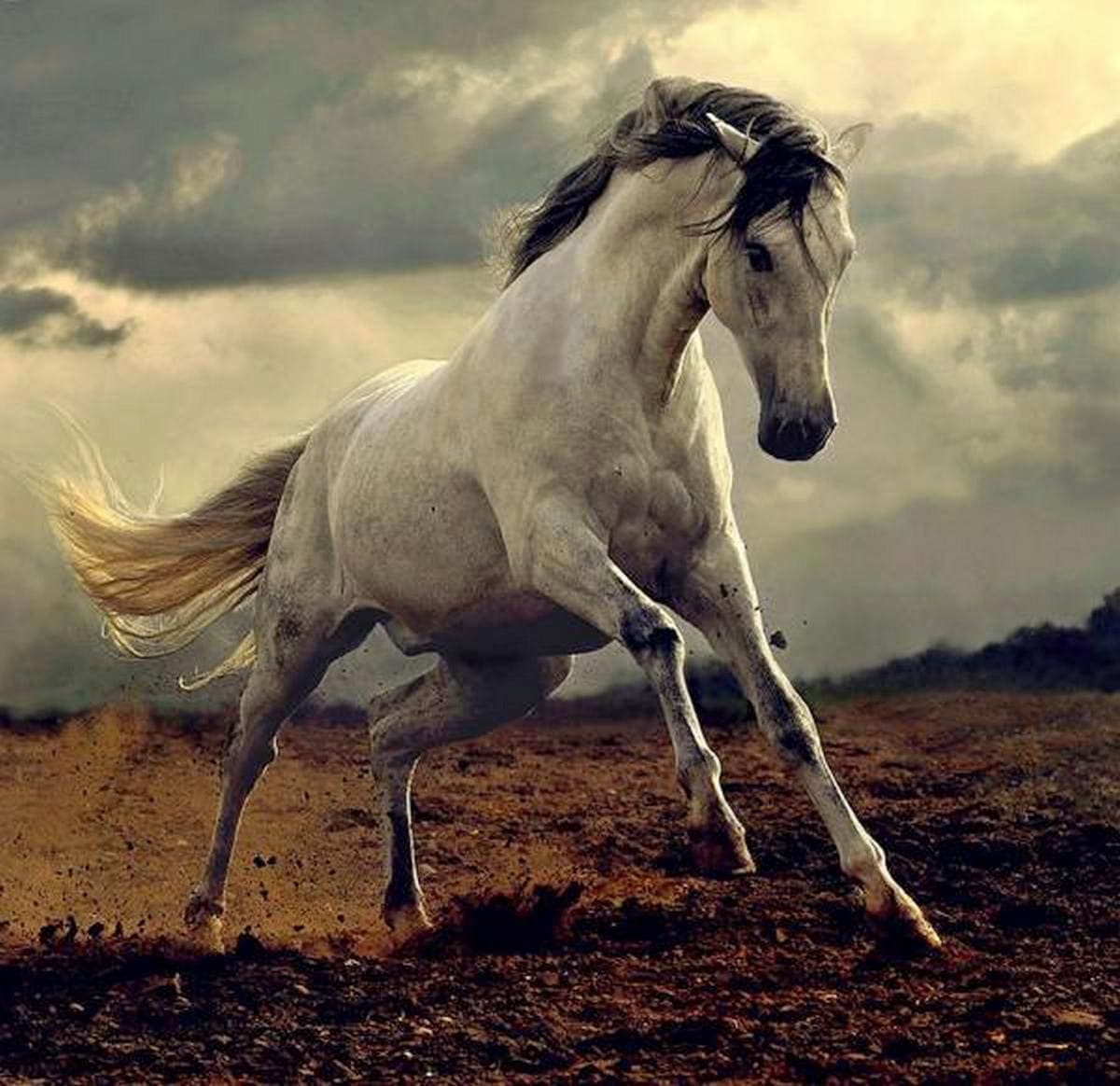Белый конь с темной гривой прыгает на фоне облачного неба