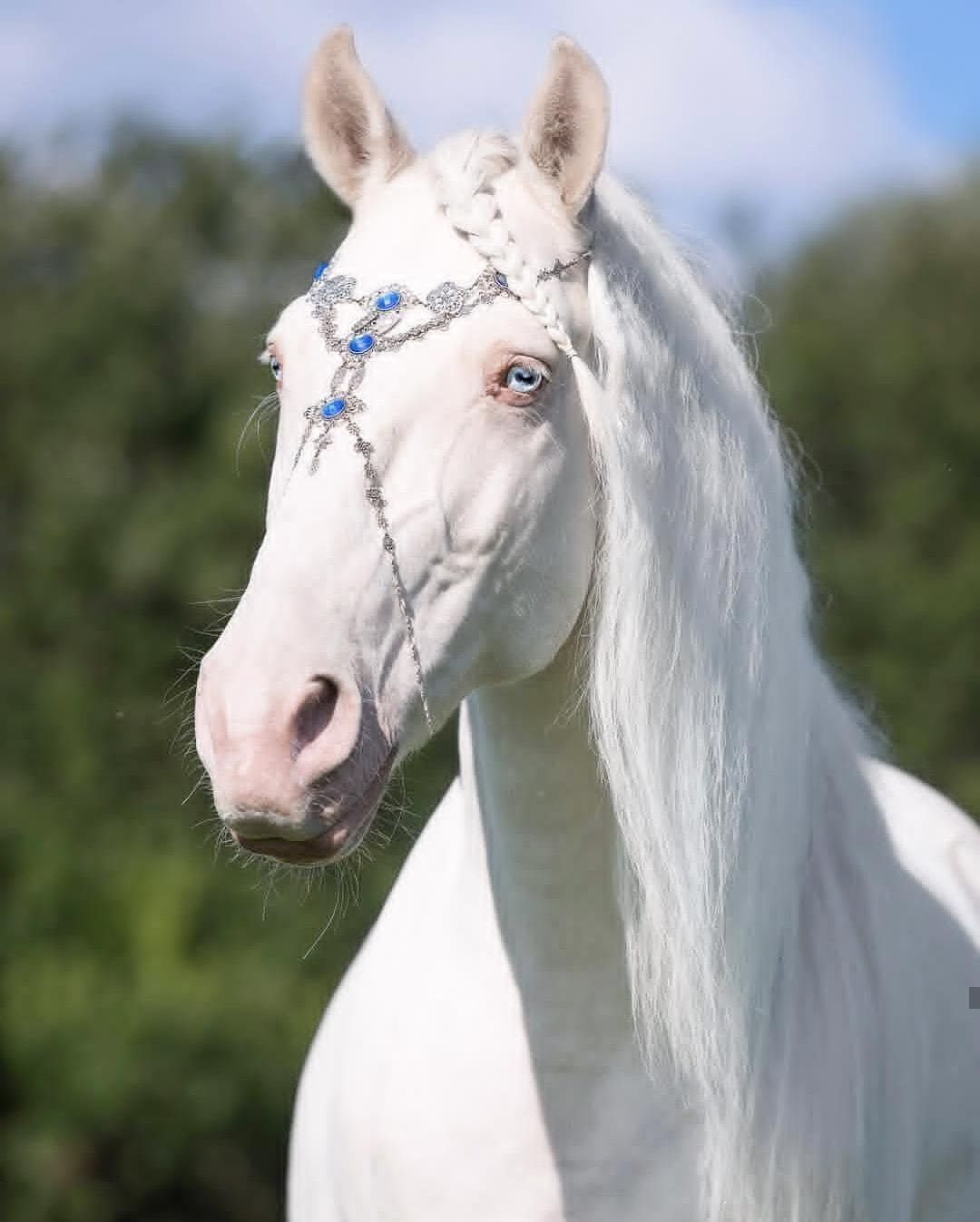 Белоснежная лошадь стоит на фоне голубого неба с красивыми белыми облаками