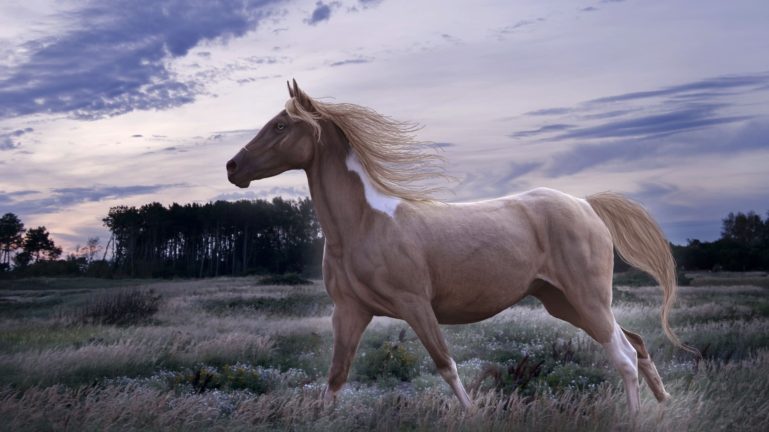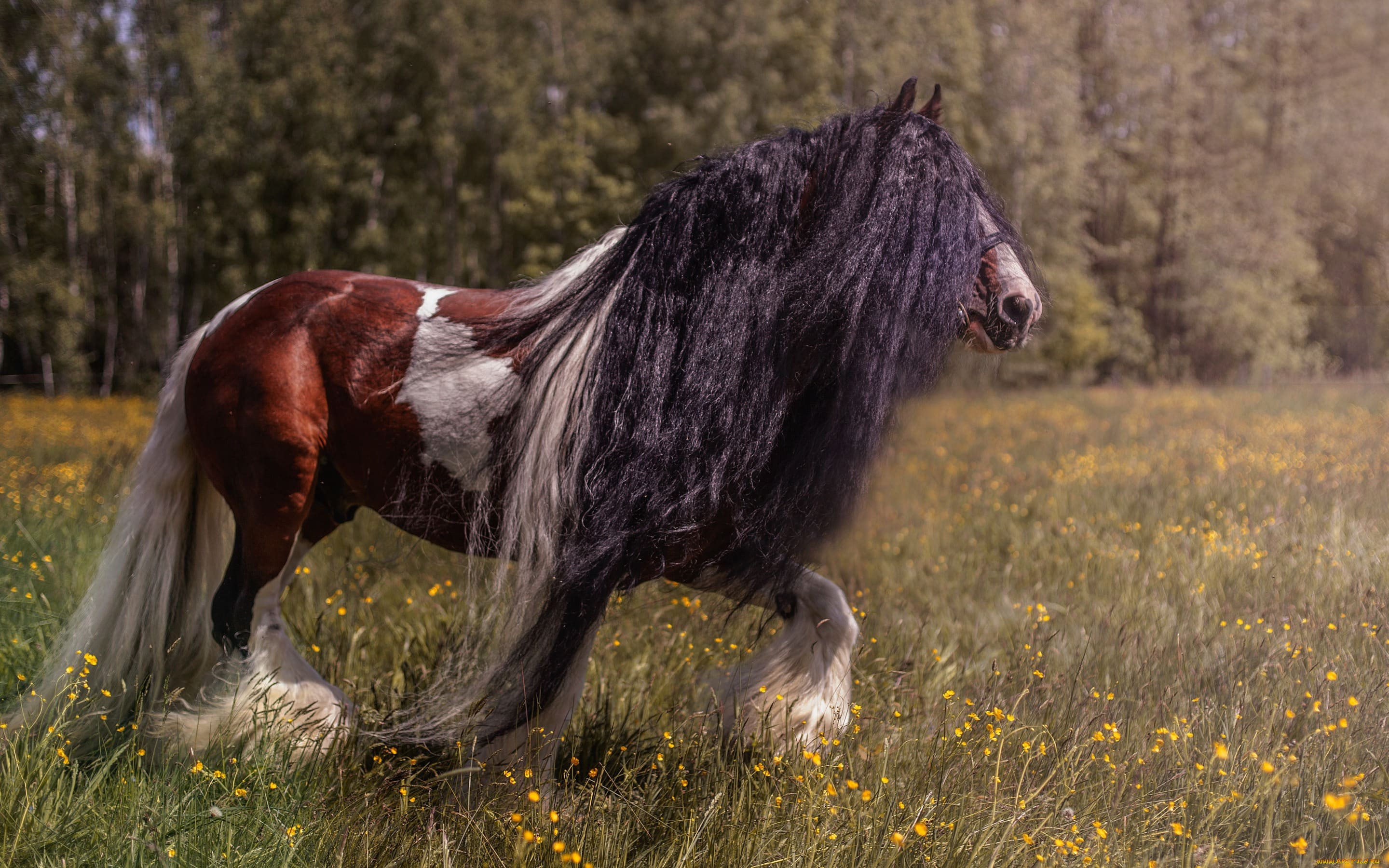 Необычная лошадь с длинной волнистой гривой идет по полю на фоне леса