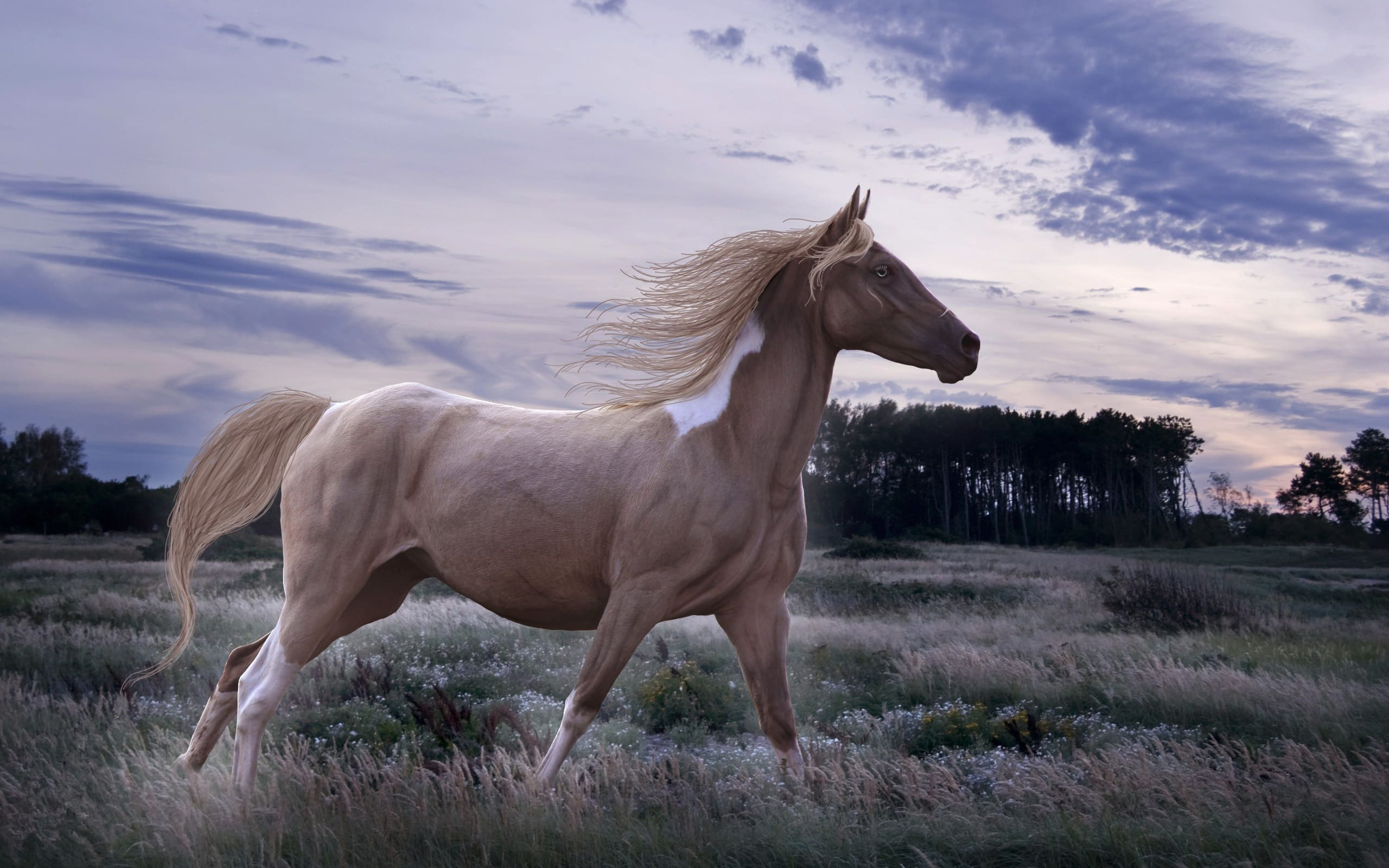 Красивая лошадь редкого окраса с роскошной белой гривой скачет по зеленой траве