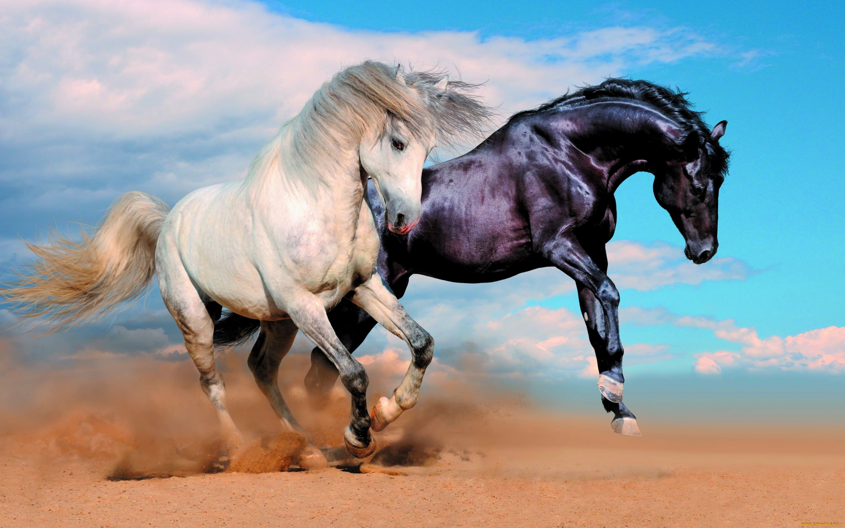 Белая лошадь и черная лошадь резвятся в песке под голубым небом, покрытым белыми облаками