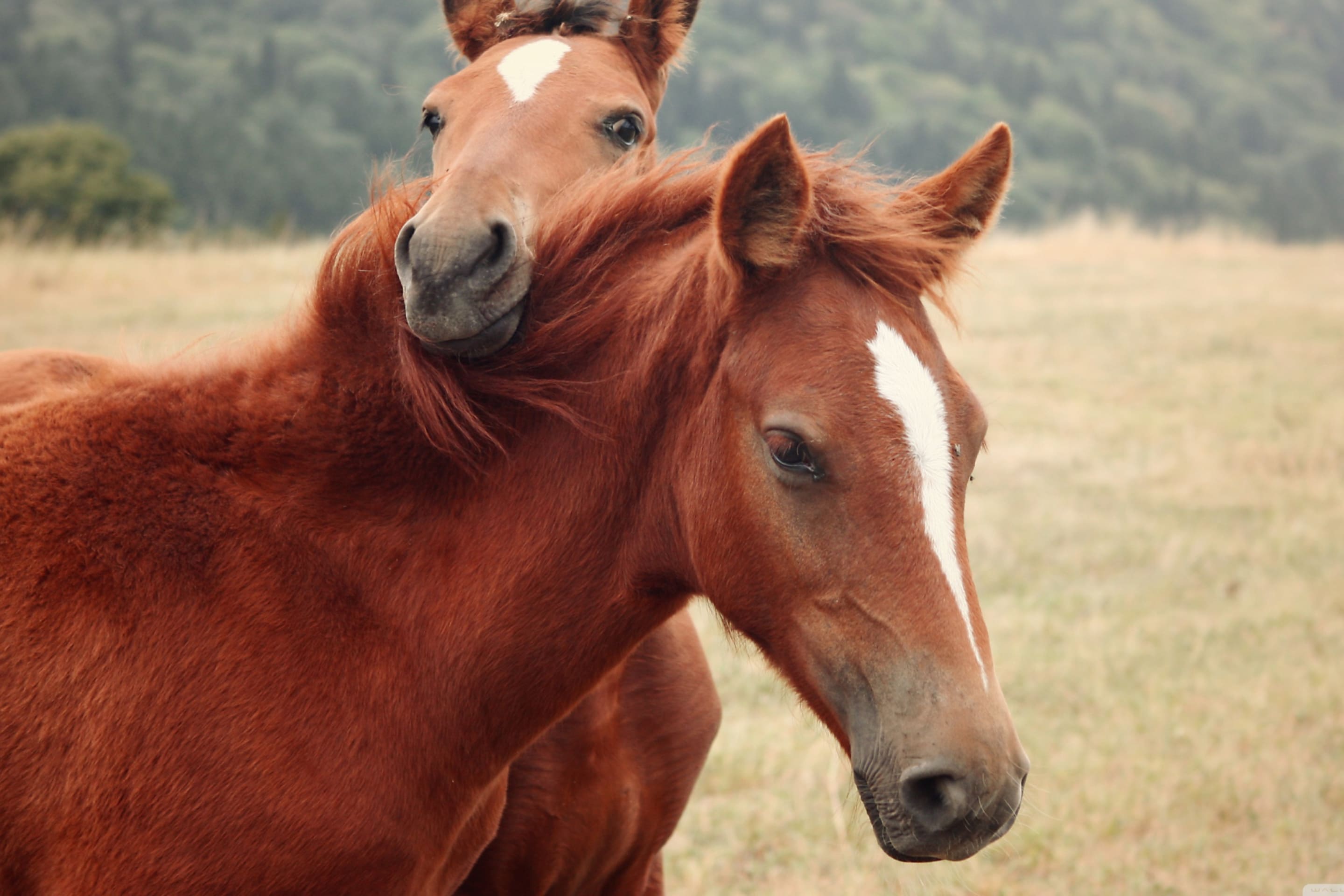 Пара коричневых лошадей с белыми пятнами на лбах в поле