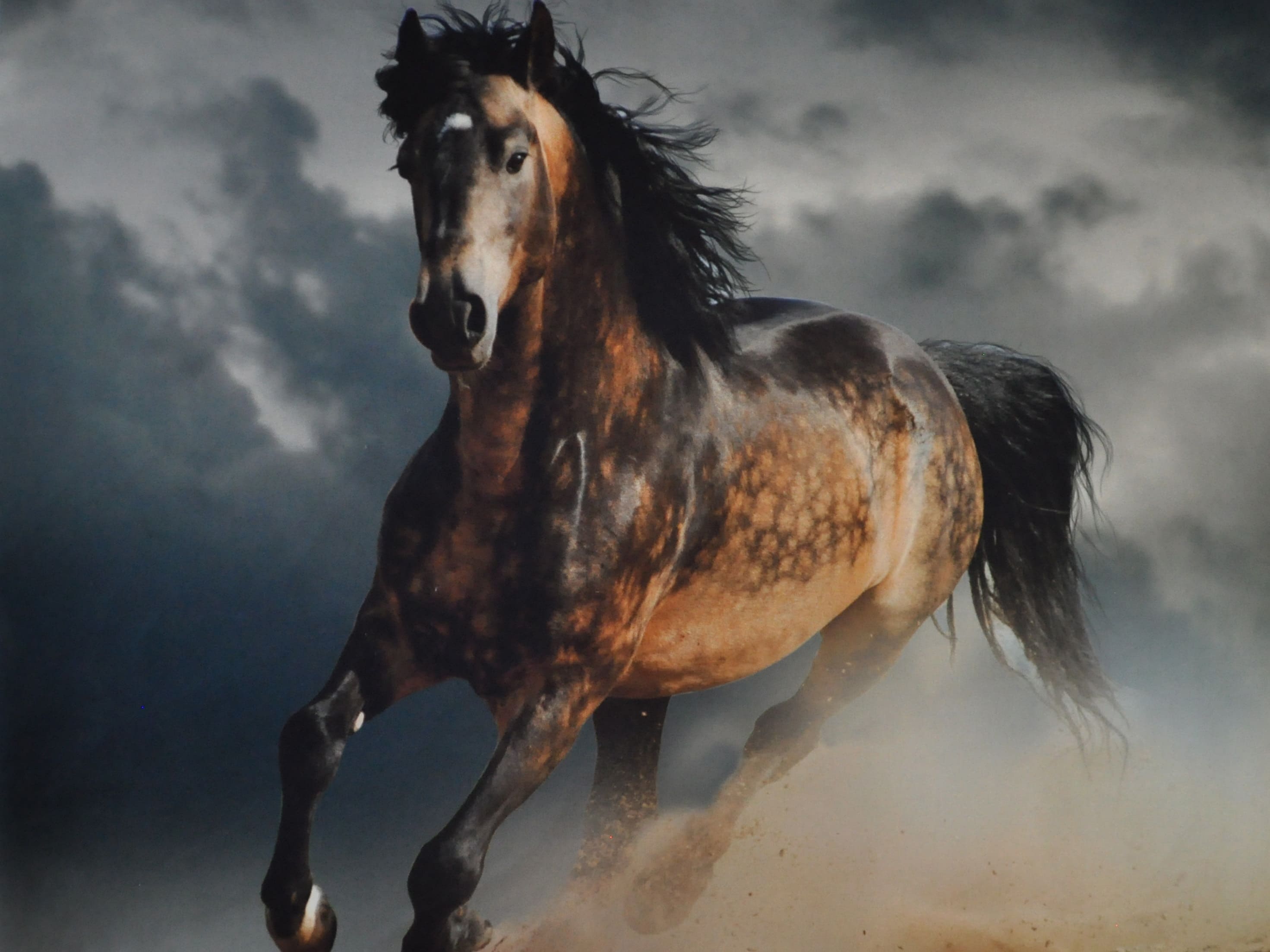 Прекрасная пятнистая лошадь мчится вперед на фоне черных туч