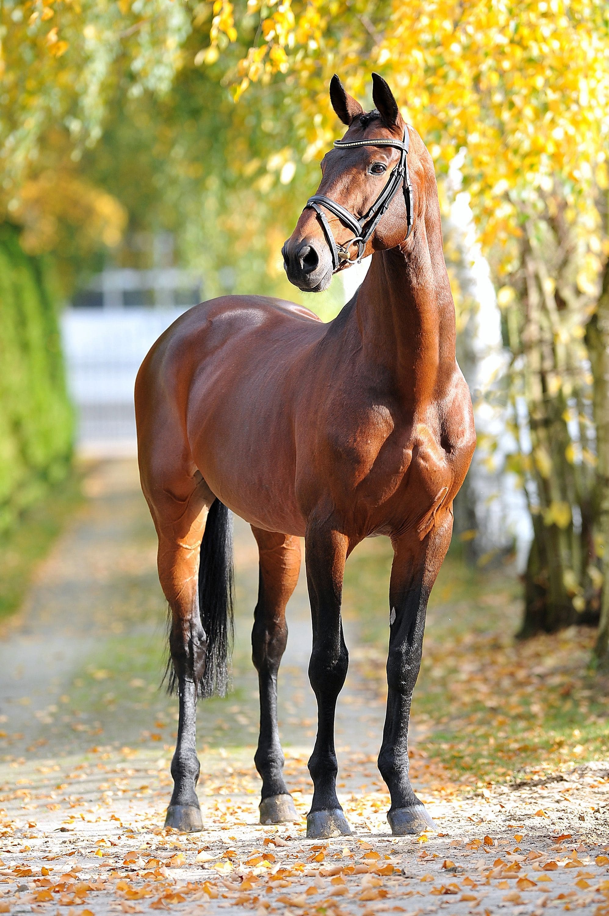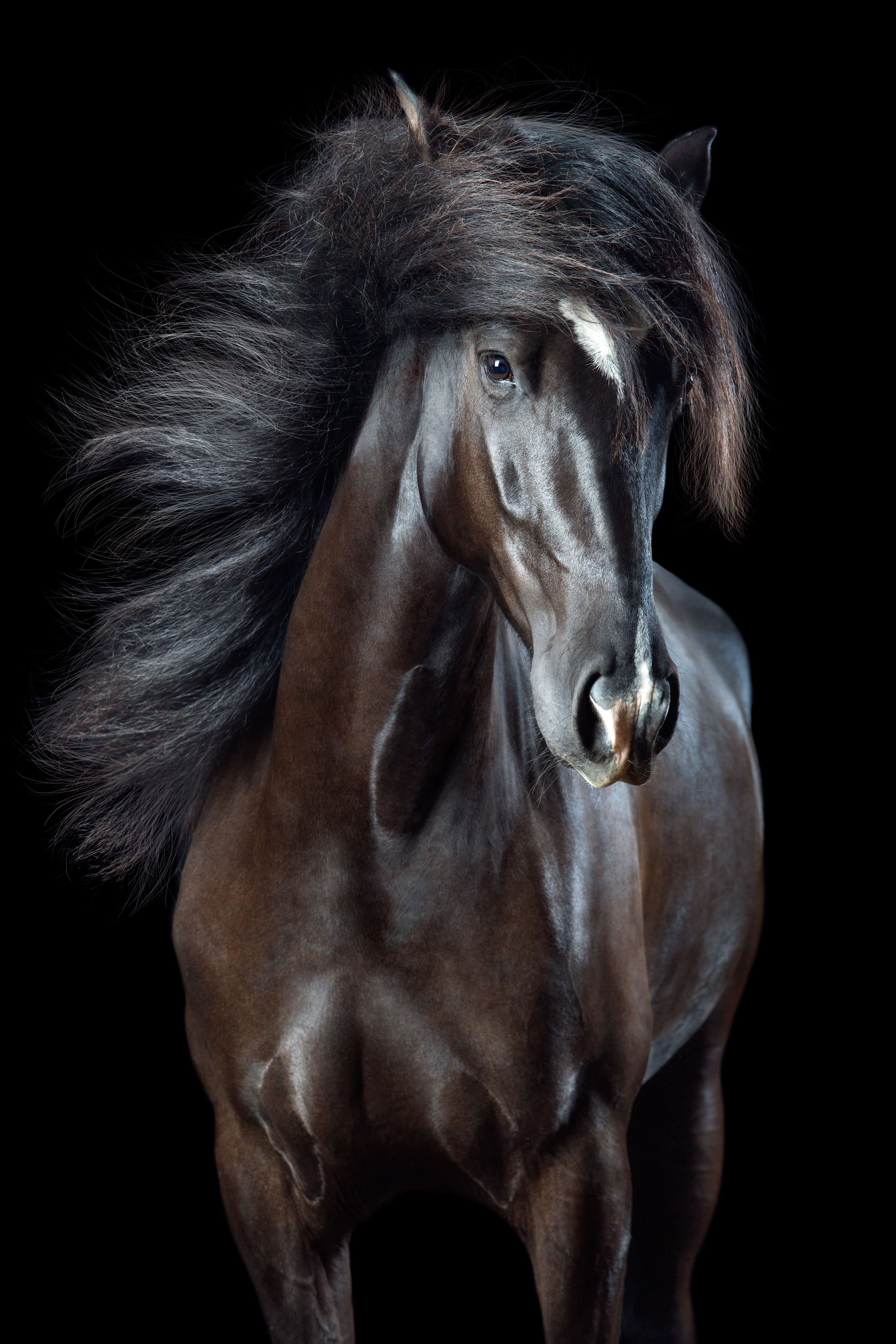 Задумчивый коричневый конь с черной гривой и белым пятном на лбу
