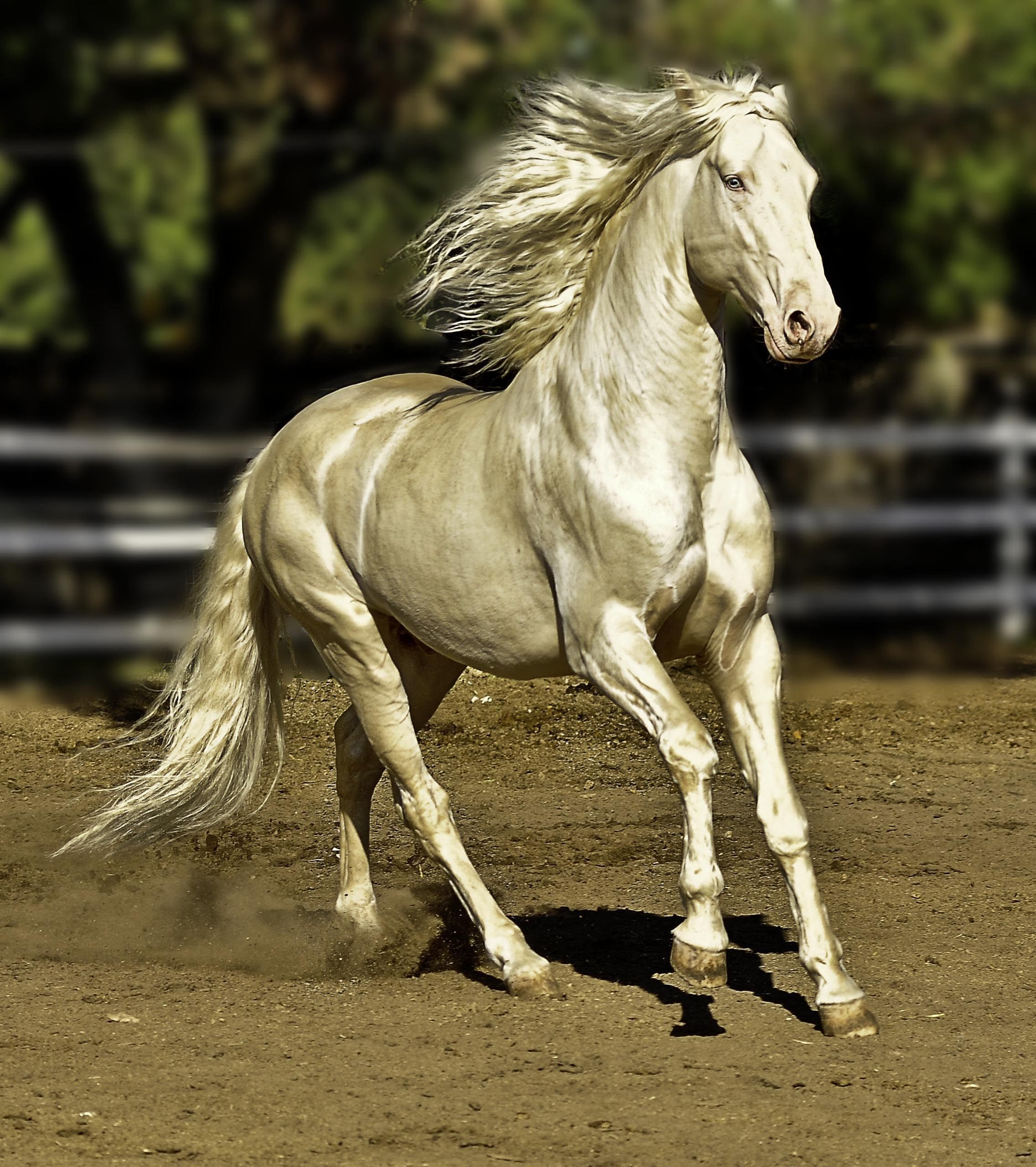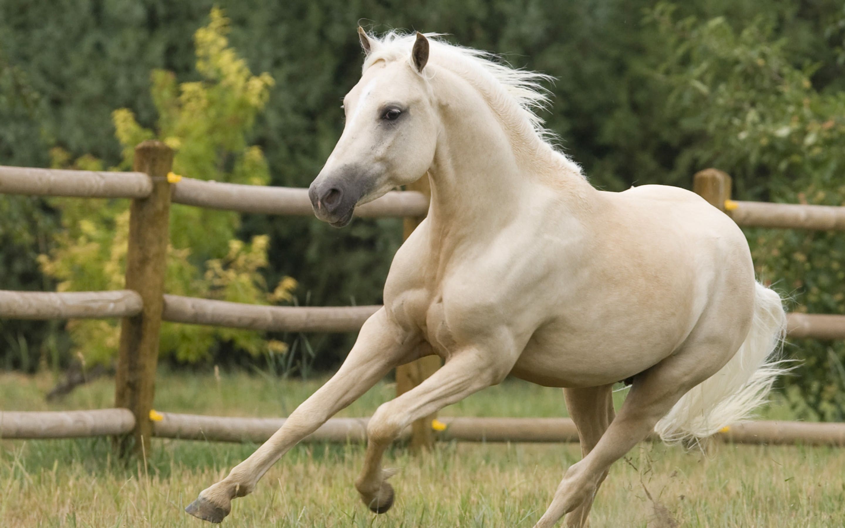 Мускулистая белая лошадь скачет вдоль деревянной изгороди на фоне листвы