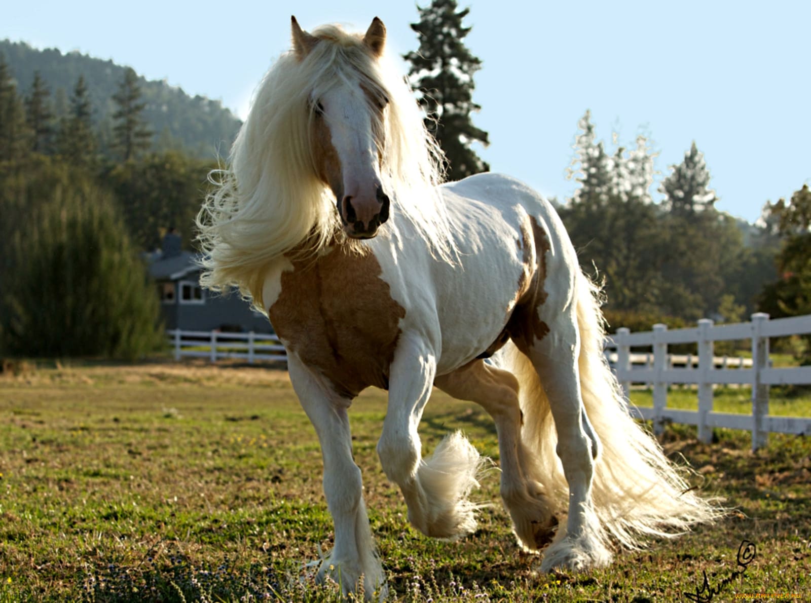 Необычная лошадь с густой светлой гривой на фоне безоблачного голубого неба