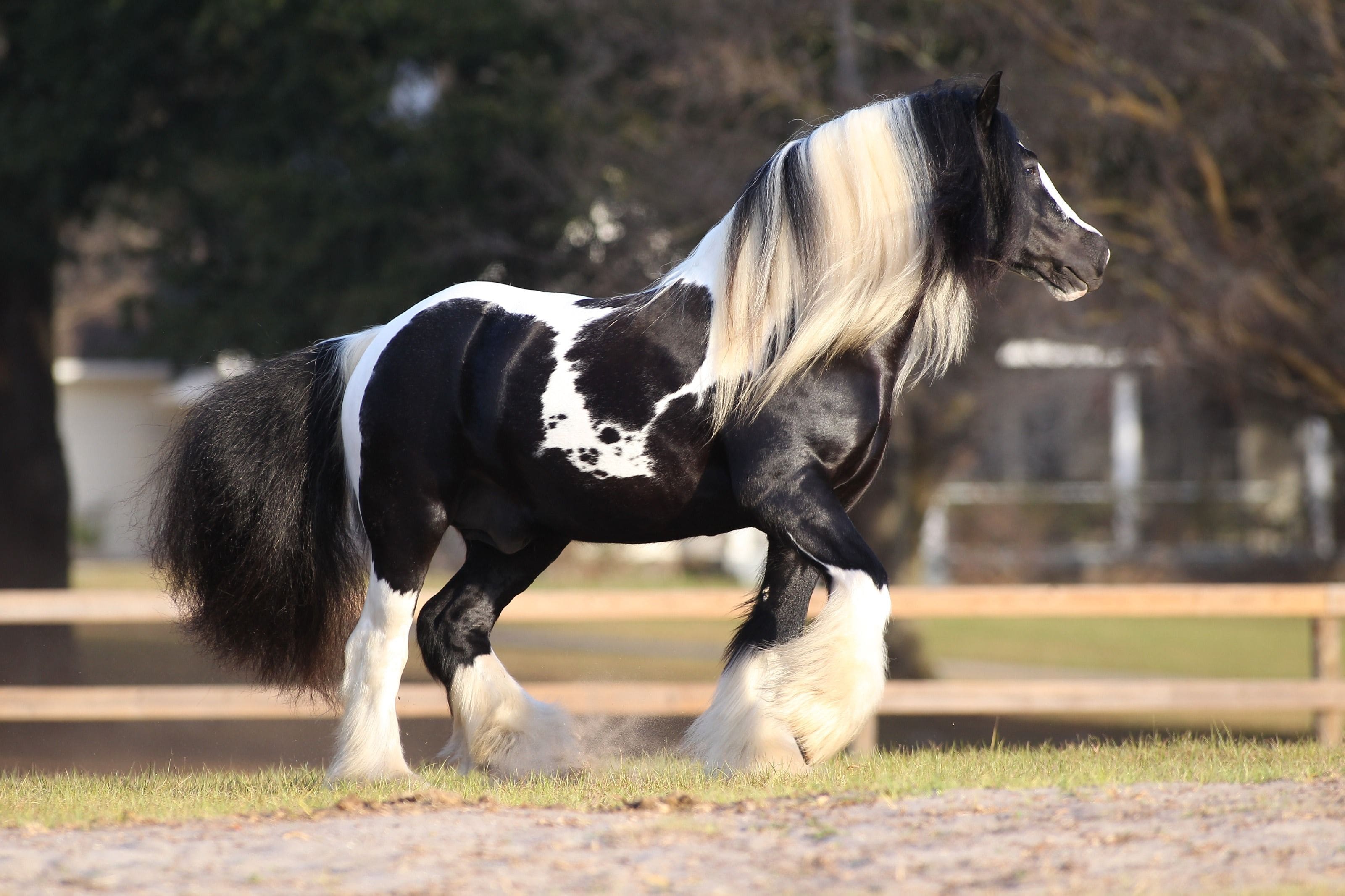 Ухоженная лошадь редкой породы с черно-белой гривой стоит у ограждения