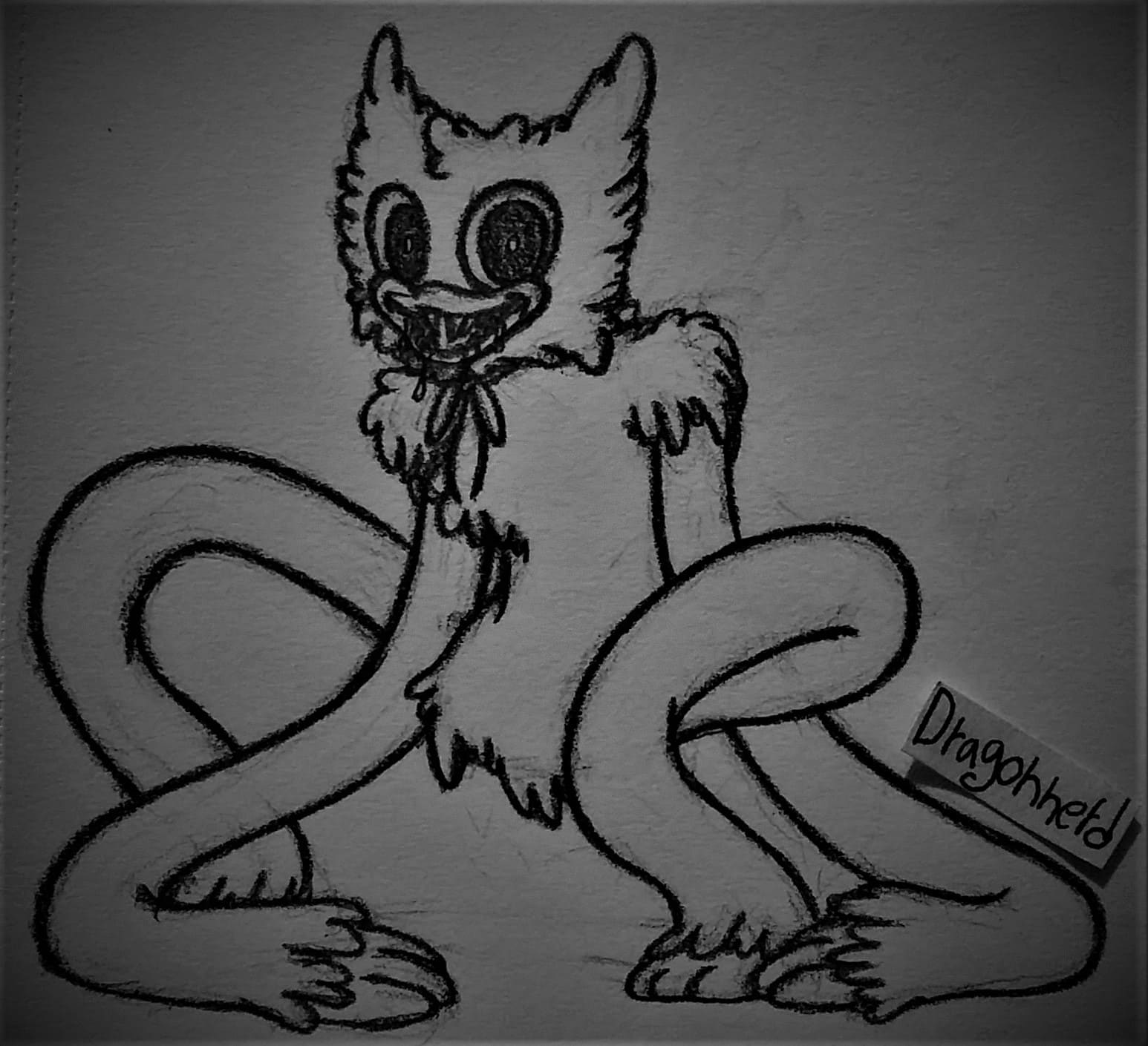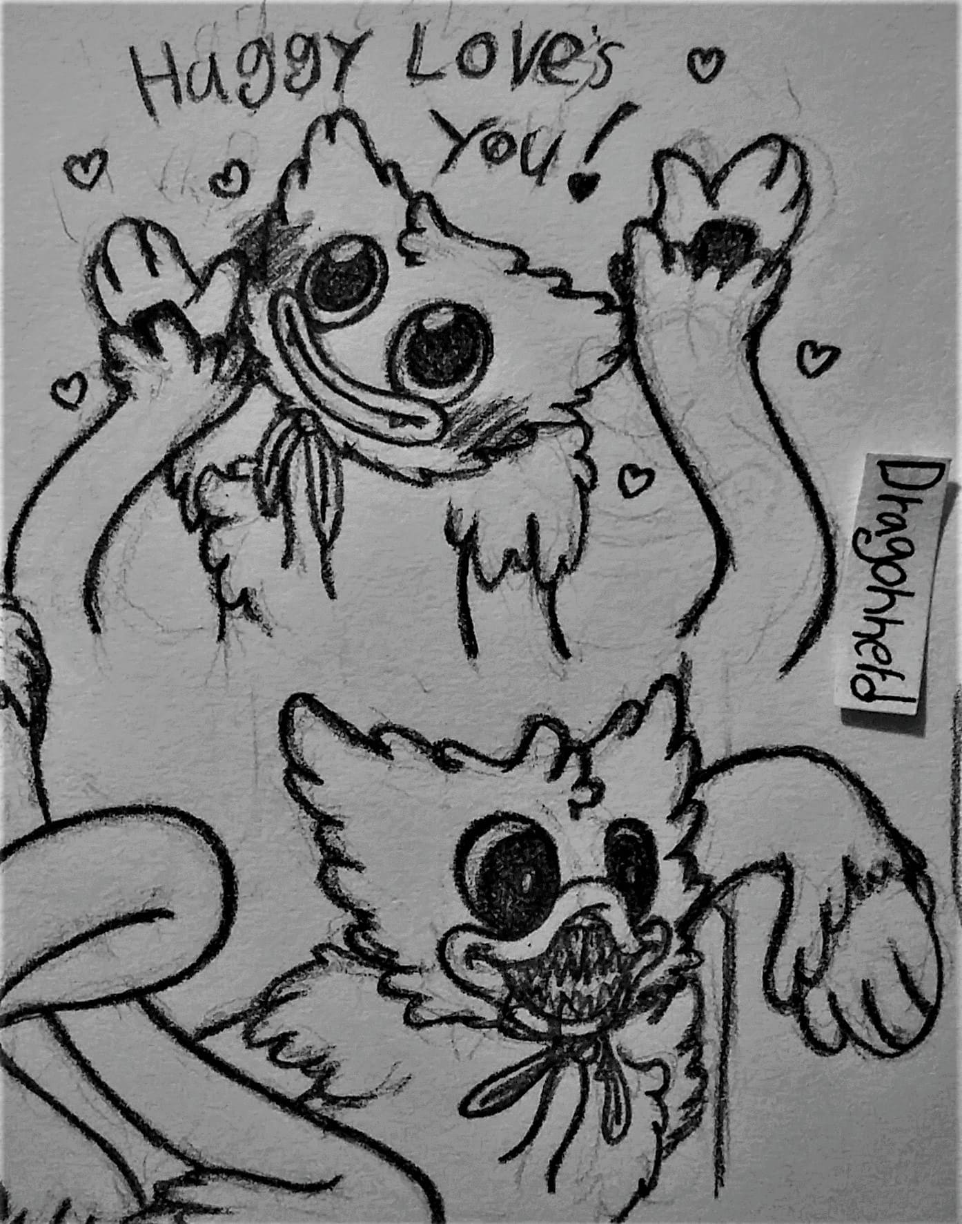 Карандашный рисунок, фанарт Хагги Вугги с острыми зубами и желтыми когтями. Карандашные штрихи делают его ещё более страшными