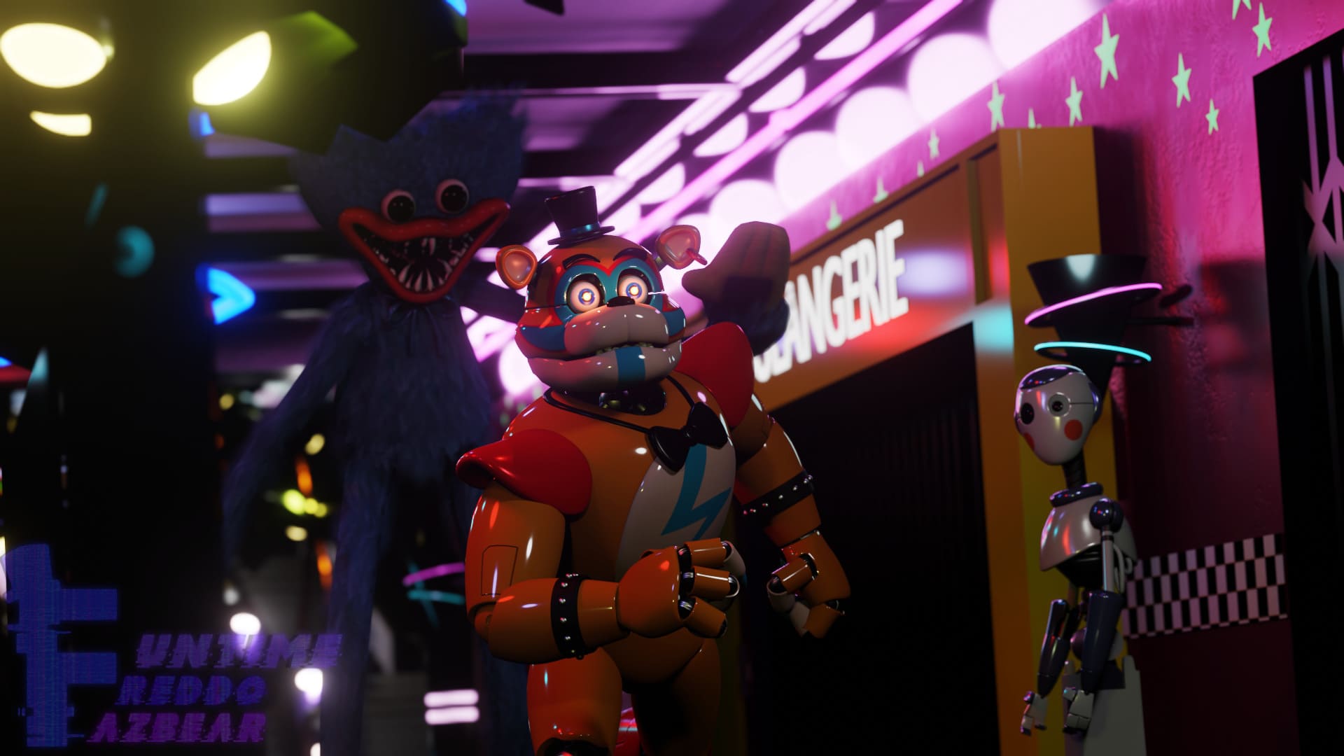 Хагги Вугги прячется у стены, чтобы внезапно обнять вас. На стене висит плакат Five nights at Freddy’s