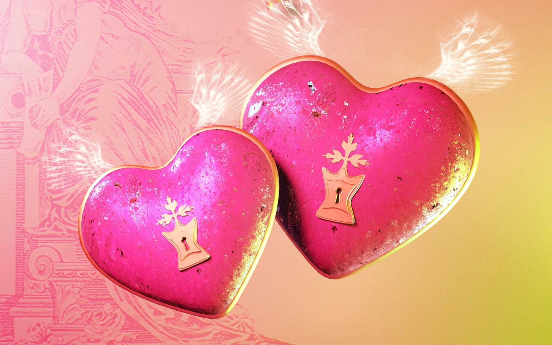 Два красивых сердечка с замочными скважинами и ангельскими крыльями