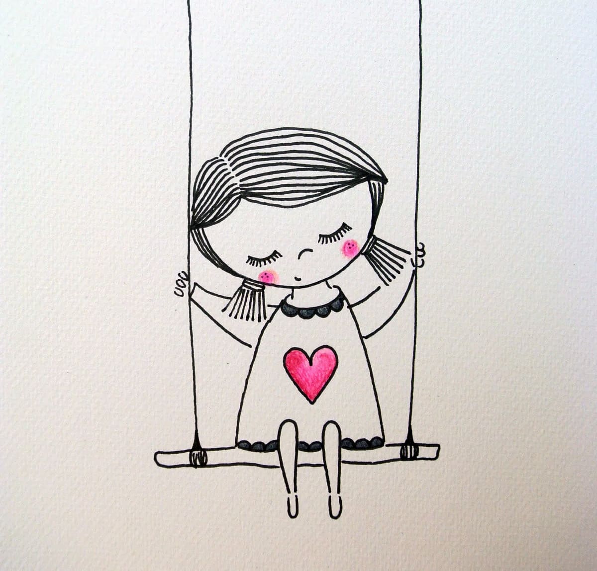 Маленькая девочка на качелях. Цветные элементы и кружева на платье придают этому рисунку особый шарм