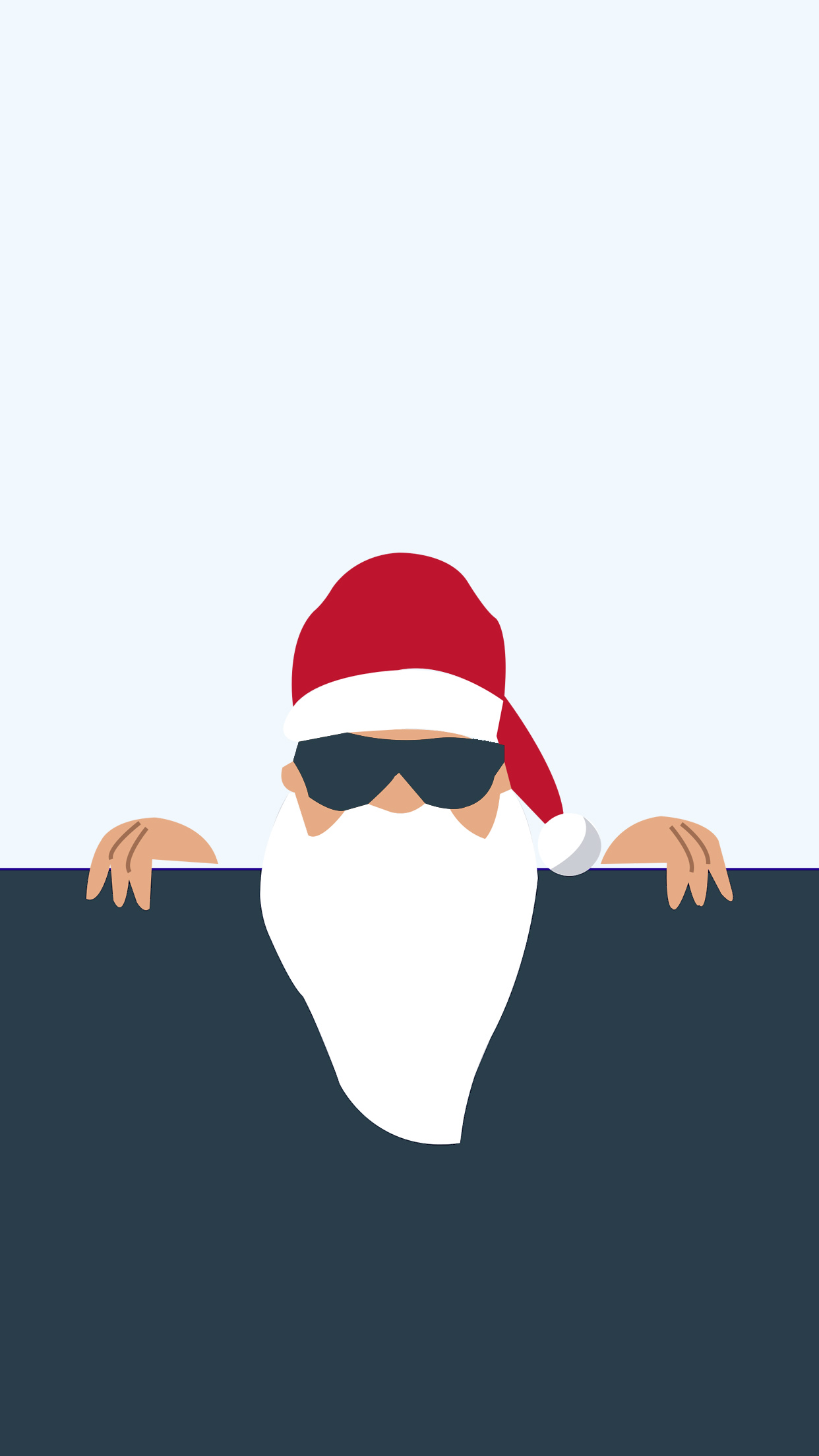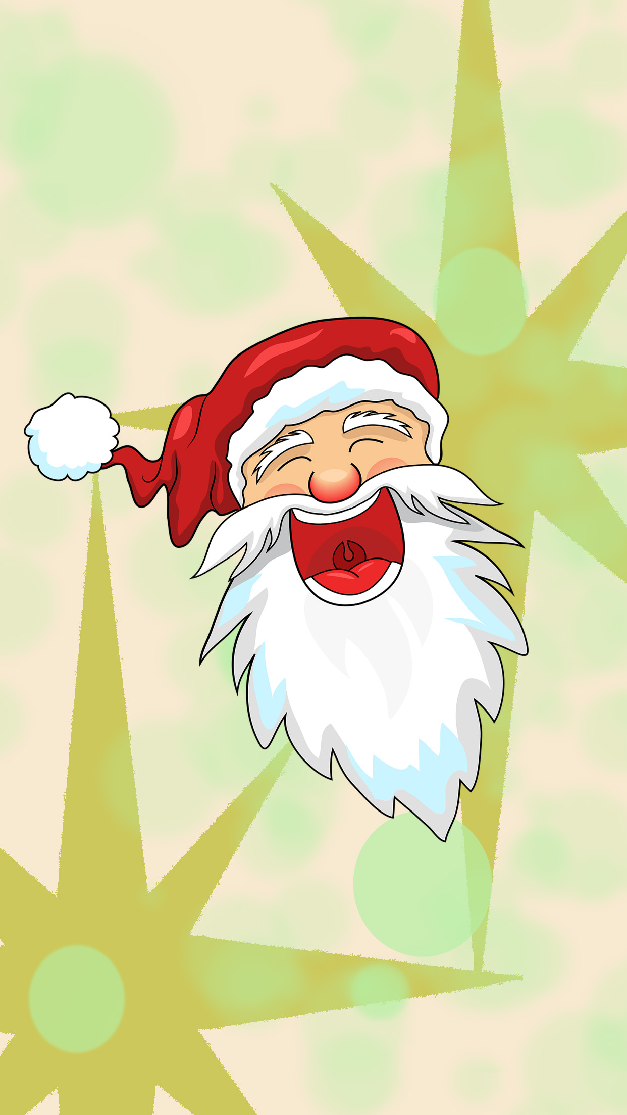 Verblüffter Weihnachtsmann vor dem Hintergrund weißer Bäume. Lustige Handy-Wallpaper für Weihnachten